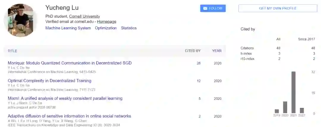 陆昱成本科就读于上海交通大学,现在是康奈尔大学计算机科学博士研究生,师从 Christopher De Sa 教授,研究兴趣主要集中在构建可扩展、可证明正确的机器学习系统等方面,研究项目涉及通信压缩、模型压缩、去中心化等。他在去中心化学习方面的研究获得了 ICML 2021 年度杰出论文荣誉提名奖。