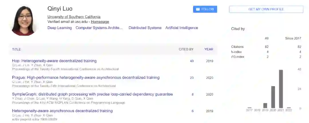 骆沁毅本科就读于清华大学,现在是南加州大学计算机科学专业的博士生,师从钱学海博士,研究兴趣主要集中在机器学习的高性能分布式训练系统等方面,尤其是新型并行化和同步化方法的开发。
