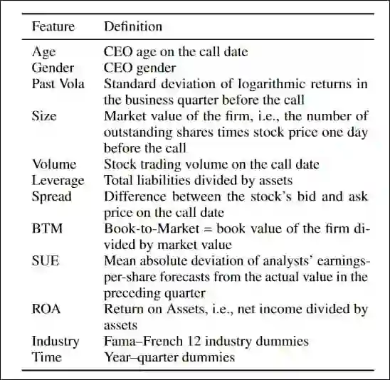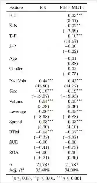 为了识别和描述 CEO的言论,研究人员使用了来自路透社Refinitiv EIKON数据集的 88000 份财报电话会议记录,并以编程方式将指定的 CEO 按年龄和性别数据进行匹配。 为了获得个性标签,研究人员使用了个性数据库,这是一个用户贡献的个性评估众包平台,提供了 32 位大公司CEO(包括乔布斯和马斯克)的足够个性数据。为了验证估计,研究人员在基于人群的 MBTI 和 Big 5 模型投票之间构建了相关矩阵,用于数据中确定的所有对应人物。结果发现,这两个模型下对评估数据的结果高度一致。研究测试了 BERT ( base )、RoBERTa ( base ) 和支持向量机 (SVM)等多个模型 ,。训练后,发现 RoBERTa 表现最好。在下图中,我们看到了模型对马斯克个性的各种估计:为了促进项目的风险回归,作者研究人员又将CEO的财报电话会议言论数据与来自 IBES、CRSP 和 Compustat Execucomp 的数据库进行了合并。为了在 CEO 发表言论后预测股价变化,研究人员结合了先前工作中的各种风险agent,还结合了年龄和性别,以评估可能带来的多重影响。下面是CEO言论——企业风险模型的指标列表及其定义。本模型中的对企业风险的评估指标
