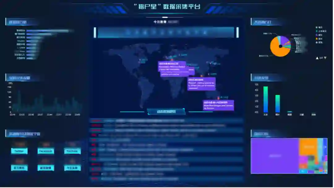 其中,猎户星数据采集平台基于分布式数据采集技术,目前采集完成近14亿的文本、图片、视频、音频等多模态数据以及千亿级海空目标数据,来源超过40多个国家和地区,覆盖中文、英文、日文、阿拉伯文等80多种语言,具备全面性、专业性、多样性、完整性、扩展性等特点,为开源信息智能分析与应用提供数据支撑。