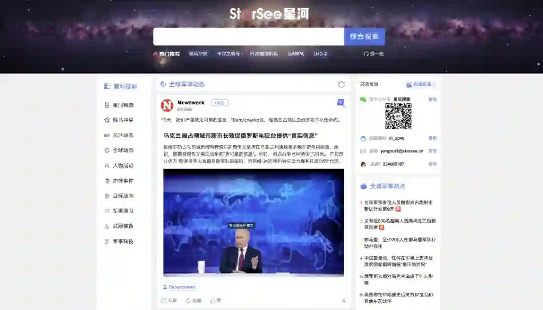 星河搜索(https://xinghe.starsee.cn),摄星智能旗下自研的面向全球视角的智能防务信息服务平台。