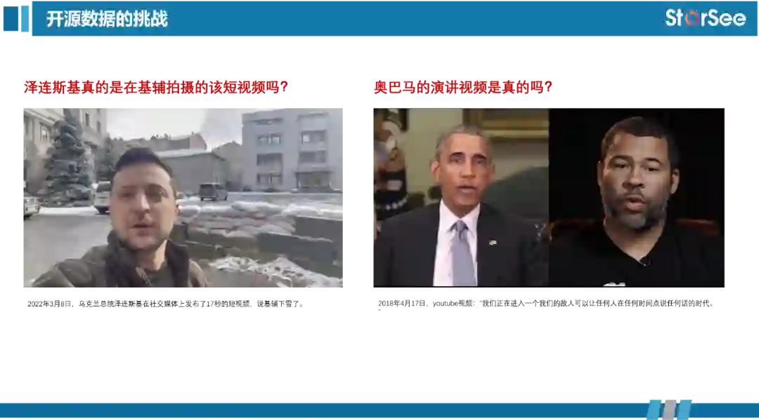 最后,张侨分析了开源数据也面临着严峻的挑战,现实生活中,我们也会被多种多样的虚假情报迷惑,如人为杜撰、歪曲事实、合成影像、深度伪造等技术制造的虚假情报。我们看到的某一事件可能不会完全准确或真实。