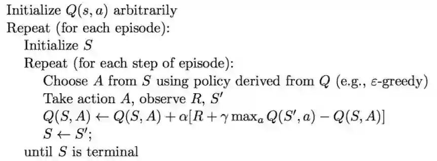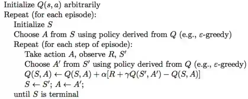 s 为当前状态,a 是当前采取的动作,s’ 为下一步状态,a’ 是下一个状态采取的动作,r 是系统获得的奖励, α 是学习率, γ 是衰减因子。