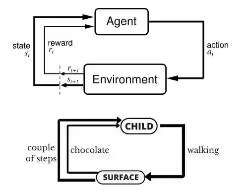 小孩就是 agent,他试图通过采取行动(即行走)来操纵环境(行走的表面),并且从一个状态转变到另一个状态(即他走的每一步),当他完成任务的子任务(即走了几步)时,孩子得到奖励(给巧克力吃),并且当他不能走路时,就不会给巧克力。