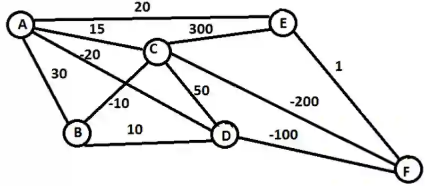 我们要从 A 走到 F,每两点之间表示这条路的成本,我们要选择路径让成本越低越好: