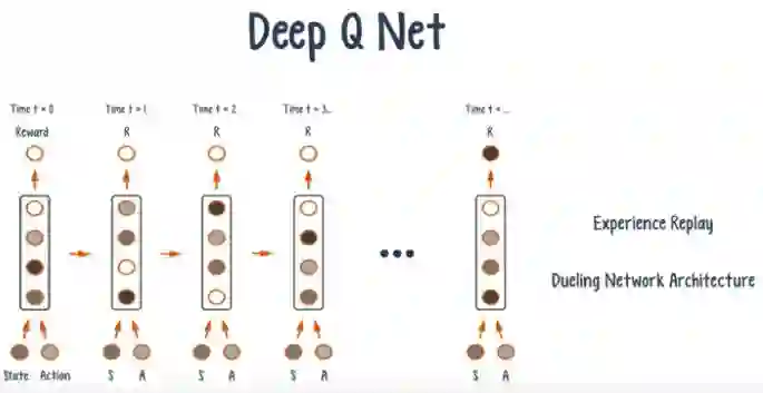 DQN 算法的主要做法是 Experience Replay,将系统探索环境得到的数据储存起来,然后随机采样样本更新深度神经网络的参数。它也是在每个 action 和 environment state 下达到最大回报,不同的是加了一些改进,加入了经验回放和决斗网络架构。