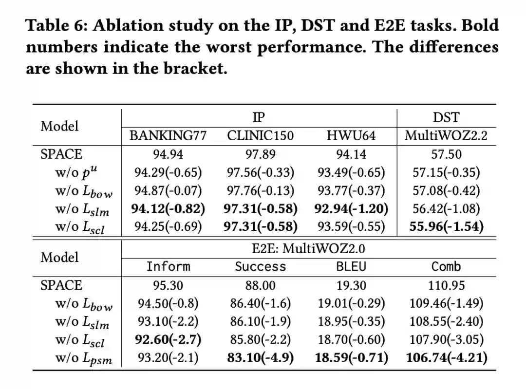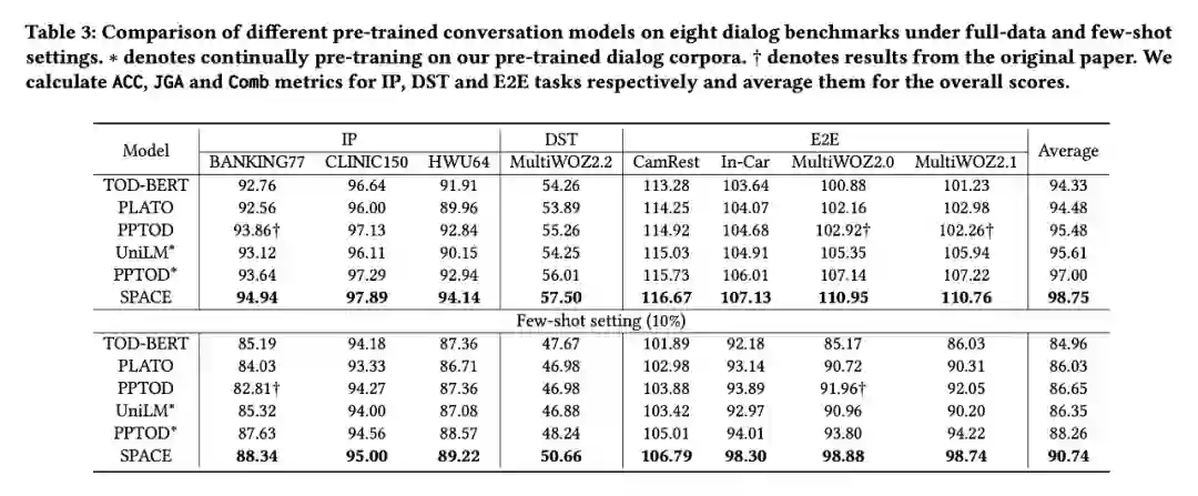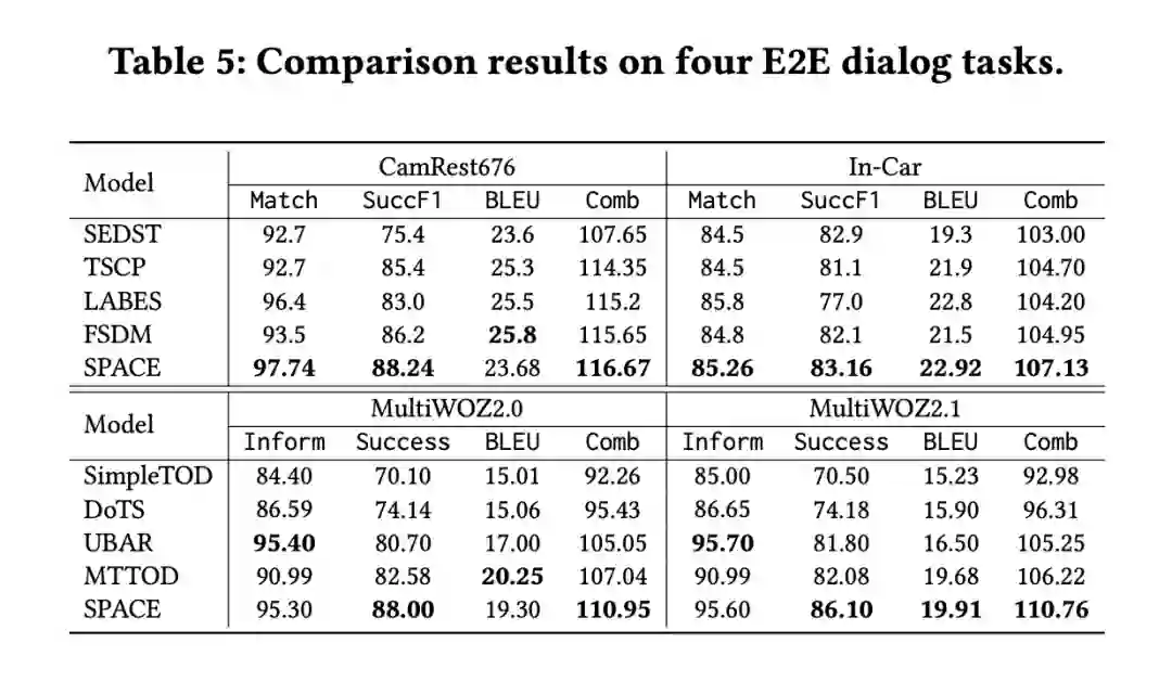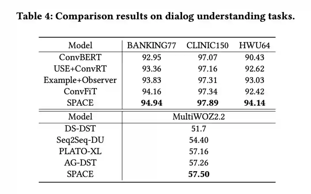 实验结果表明,SPACE 在下游 3 类任务型对话任务(意图识别、对话状态追踪、端到端对话建模),共计 8 个数据集(BANKING77,CLINC150,HWU64,CamRest,In-Car Assistant, MultiWOZ2.0/2.1/2.2)上均取得了 SOTA 性能。