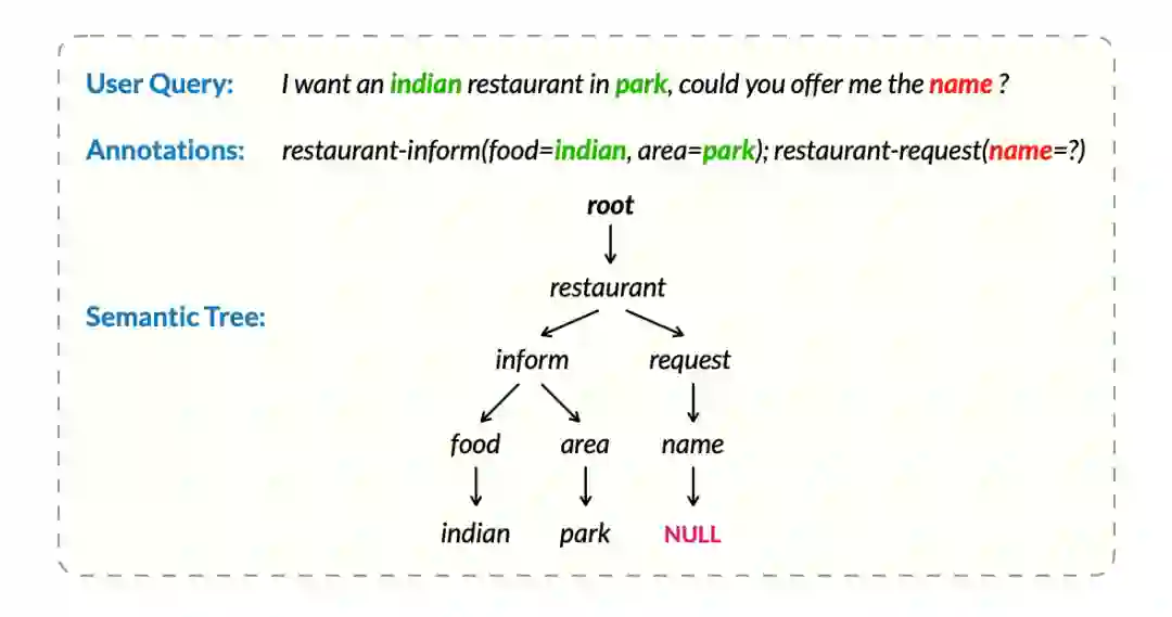 如此的语义标注信息自然地能够展开为一棵半结构化的多叉树,这里我们将它称为语义树。一棵标准的语义树通常包含四层结构:领域层,意图层,词槽层和实体层。每层都把语义标注中的相应成分视作该层的节点。如果其中某层没有相应的标注信息提供,那么该层的节点将被置为空节点 (NULL)。具体来说,语义树第一层由域节点组成,作为根节点 (root) 的后继节点和意图节点的前驱节点。词槽节点占据语义树的第三层,同时作为意图节点的孩子节点和词槽节点的父节点。最后,实体节点作为叶子节点占据语义树的最后一层。