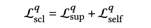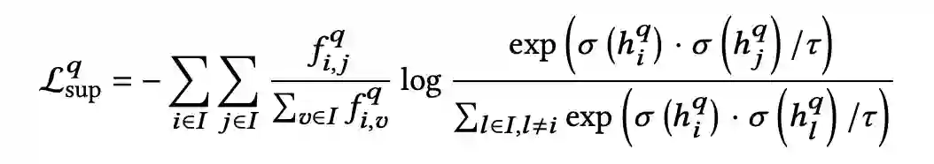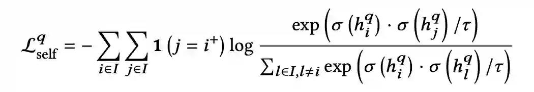 对于没有语义标注的用户查询语句,我们采用简单的自监督对比学习目标,只有增强后的样本会被当作成为正例,具体的计算公式如下: