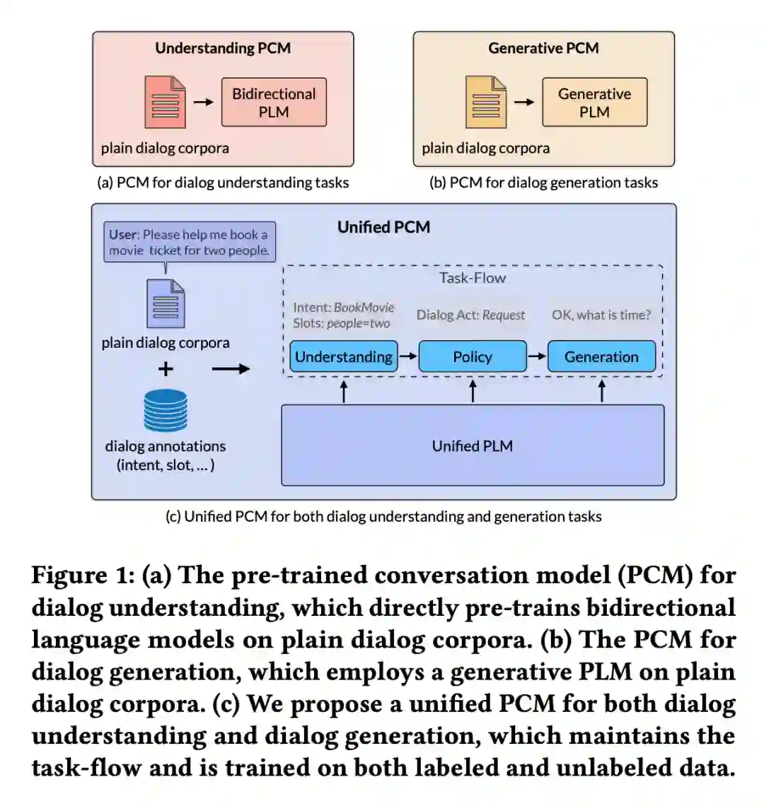 1. 如 Figure 1 (a)-(b) 所示,现有的 PCMs 只针对对话理解或者生成相关特性进行构建,因此一个 PCM 在只能去解决对话理解或者生成相关的下游任务,缺乏一个统一的 PCM 对各种类型的对话任务进行统一的建模;
