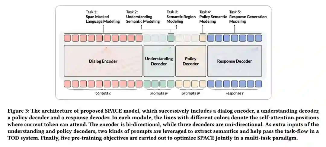 在编码器中我们采用双向的自注意力机制,在三个解码器中采用从左到右的单向自注意力机制以维护任务流的单向流动性。针对不同的模块,我们设计了专门的 5 个预训练目标:片段掩码语言建模、半监督理解语义建模、语义区域建模、策略语义建模和回复生成建模,最终以多任务学习的方式来训练整体模型。