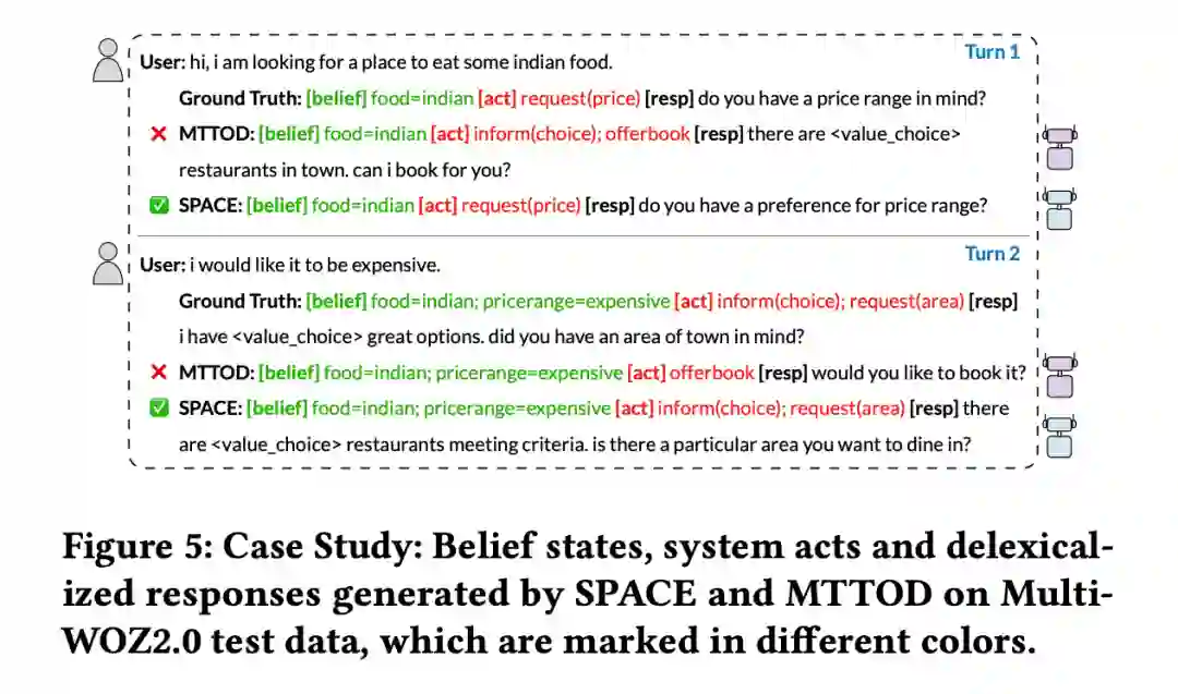 如下图所示,我们直观的展示了 SPACE 模型和其他 baseline 模型在端到端对话生成任务上的生成结果。从对比中可以看出,我们的 SPACE 模型可以在前两轮对话中选择了正确的对话动作,以致于整体对话可以朝着完成任务的正确方向进行延续,也验证了我们的模型具有很强的策略规划和回复生成的能力。