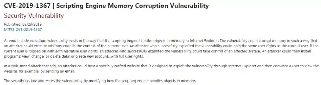 根据微软发布的安全公告,引发此漏洞的根本原因是脚本引擎(Scripting Engine)在内存中处理对象的方式。具体来说就是,Internet Explorer 中的脚本引擎在内存中处理对象时存在一个远程代码执行漏洞,该漏洞以这种方式来破坏内存,然后攻击者可以在当前用户的上下文中执行任意代码。