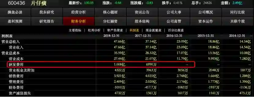 片仔癀的2018年和2017年研发费用分别是1.008亿和6990万,占当年营收比重为2.12%,1.88%。