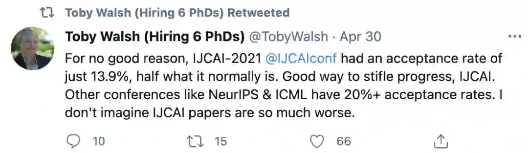 就连本次大会Survey Track主席Toby Walsh还对此表示,「 IJCAI-2021论文的接收率是正常标准的一半,像NeurIPS、ICML 等其他会议都超过20%,我不认为IJCAI的论文会如此糟糕。」