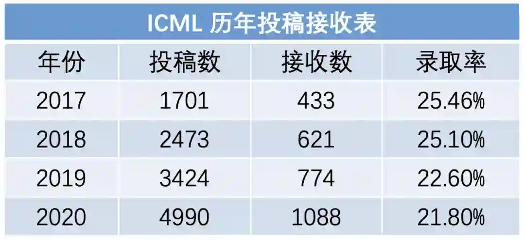 从表中可以看出,近年来的ICML投稿整体接收率一直在下降,但是一直保持在20%以上。2017年甚至达到了25.46%。
