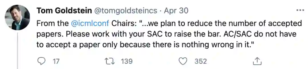 「 ICML组委会主席表示:我们计划减少录用论文的数量,请和你的SAC一起工作来提高标准。AC/SAC 不必接受那些仅仅没有错误的论文。」