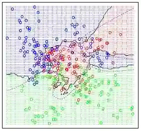 在完成上述所有步骤并确定度量之后,kNN算法的结果是将R ^ N划分为多个部分的决策边界。每个部分(在下面明显着色)表示分类问题中的一个类。边界不需要与实际的训练样例一起形成 - 而是使用距离度量和可用的训练点来计算边界。通过在(小)块中取R ^ N,我们可以计算出该区域内假设数据点的最可能类别,因此我们将该块标记为该类的区域。