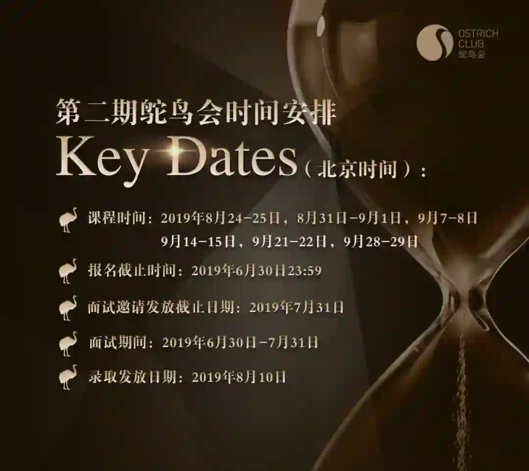 同时,感谢大家从上期鸵鸟会还未结束就开始积极报名。我们会认真对待每一份申请,并于2019年7月31日发出所有面试邀请,请密切关注你的微信/邮箱。如届时未能收到面试邀请,则代表未能进入面试环节。