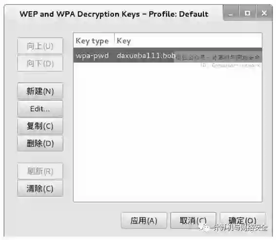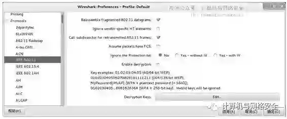 (4)在Wireshark主界面的菜单栏中,依次选择Edit|Preferences...命令,打开首选窗口。然后选择IEEE 802.11协议,添加密码,如图12所示。