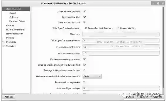 (1)在Wireshark捕获包界面的工具栏中依次选择Edit|Preferences命令,将打开如图5所示的界面。