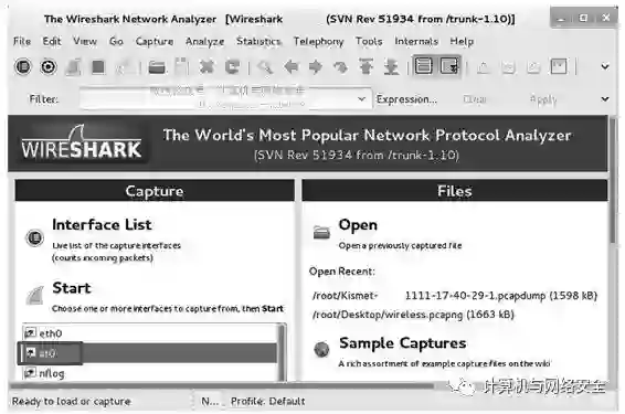 (2)启动Wireshark工具。在图形界面依次选择“应用程序”|Kali Linux|Top 10 Security Tools|wireshark命令,将打开如图1所示的界面。