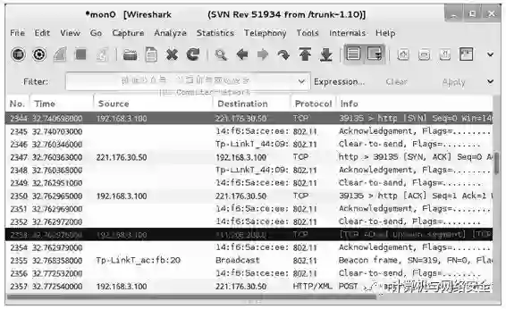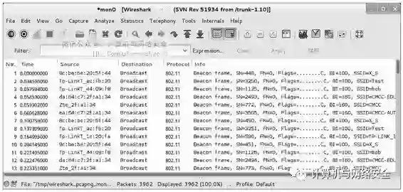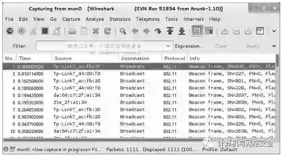 (2)启动Wireshark工具,并选择mon0接口开始捕获数据包,如图11所示。