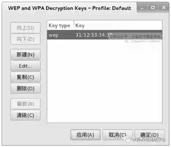 (5)在该界面的Key type文本框中选择密钥类型,该工具支持的类型有wep、wpa-pwd和wpa-psk。因为本例中WiFi使用的是WEP加密的,所以选择加密类型为wep。然后在Key对应的文本框中输入密码,这里输入的密码格式为十六进制的ASCII码值。本例中的密码是12345,对应的十六进制ASCII码值为31、32、33、34、35。所以,输入的密码为31:32:33:34:35,这些值之间也可以不使用冒号。设置完成后,单击确定按钮,将显示如图9所示的界面。