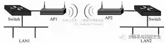 点对点桥接模式下,网络架构包括两个无线AP设备。通过这台AP连接两个有线局域网,实现两个有线局域网之间通过无线方式的互连和资源共享,也可以实现有线网络的扩展。如果是室外的应用,由于点对点连接一般距离较远,建议最好都采用定向天线。在此模式下,两台AP均设为点对点桥接模式,并指向对方的Mac地址。此时,两台AP相互发送无线信号,但不再向其他客户端发送无线信号。点对点模式的工作示意图如图17所示。