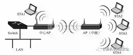 纯AP模式是最基本,又是最常用的工作模式,用于构建以无线AP为中心的集中控制式网络,所有通信都通过AP来转发。此时,AP既可以和无线网卡建立无线连接,也可以和有线网卡通过无线建立有线连接。纯AP的工作模式如图15所示。