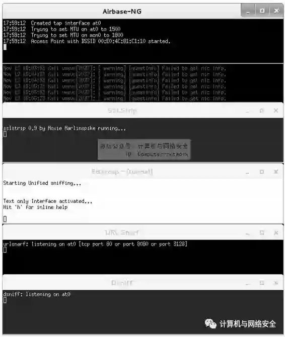 设置完以上的信息后,系统将会自动启动一些程序。如DHCP服务、SSLStrip、Etterp和Dsniff等。几秒后,将会打开几个有效窗口,如图20所示。