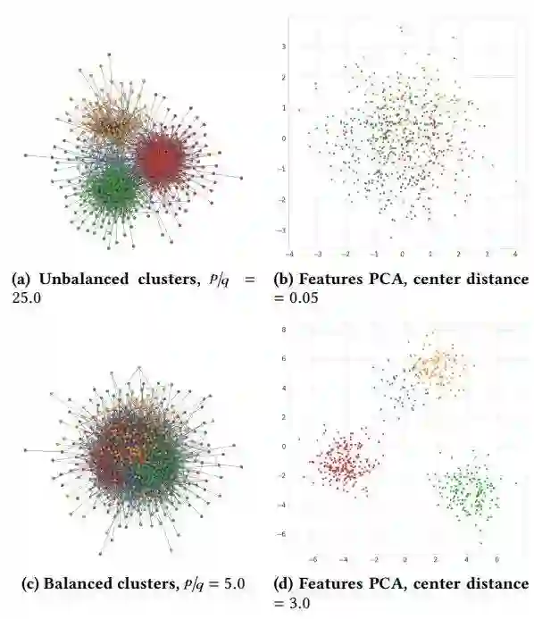 举例来说,对图样本的采样可以根据节点特征是否为一个聚类集合来划分,即p-to-q ratio。这里p和q分别表示边连接的两个节点是否被聚类成同一类别。如图所示可以直观的看出根据p-to-q ratio 划分出来的图结构: