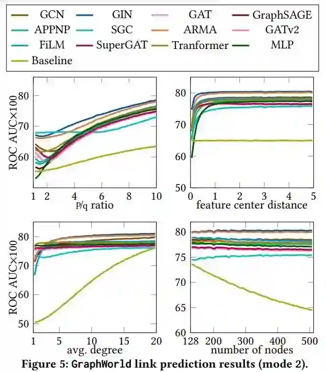实验部分作者用从数据库中采样得到的图数据做了一些分析。首先是对节点分类得到的实验结果,作者采用了多种图模型进行测试,其中baseline模型应该是指的逻辑回归。可以发现,如果单纯的增加节点数量,实际上是不会对模型准确率产生影响的。真正对大多数模型性能产生重要影响的还是p/q ratio和特征。另外,基于注意力机制的GAT系列模型也没有表现的特别好,甚至在按照特征中心距离划分的数据集上表现不佳;但如果仅仅依靠特征,如MLP模型,也不会在p/q ratio的数据上表现良好。同时,在边预测任务上也能发现相同的结果: