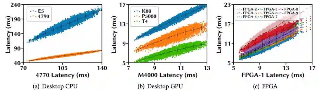 假设每次测量的理想耗时是20秒(根据TensorFlow官方指南),即使不间断地测量,在一个设备上构建延迟预测器也需要27个多小时。类似地,Meta提出的ChamNet收集了35万条延迟记录,仅仅用于在一个设备上构建延迟预测器。