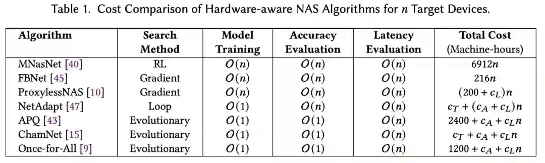 高效进行硬件适配NAS的关键是快速在目标设备上评估各个神经架构的延推理延迟。如果简单地直接测量每个架构的延迟,会导致一次NAS就需要数周甚至数月。所以SOTA硬件适配的NAS主要依赖于为每个设备建立延迟查找表或预测器。