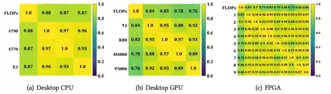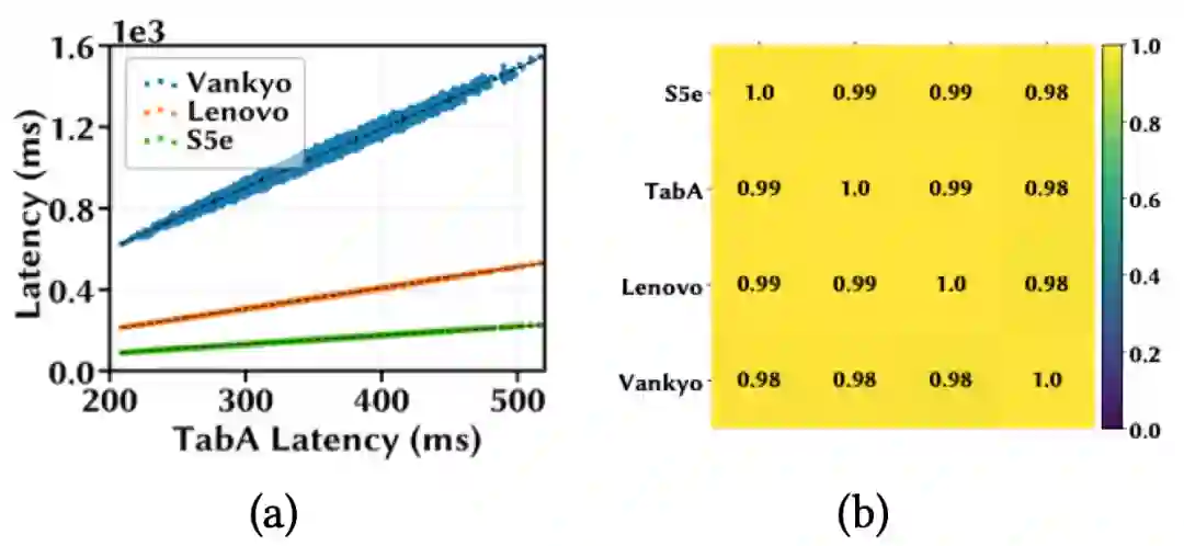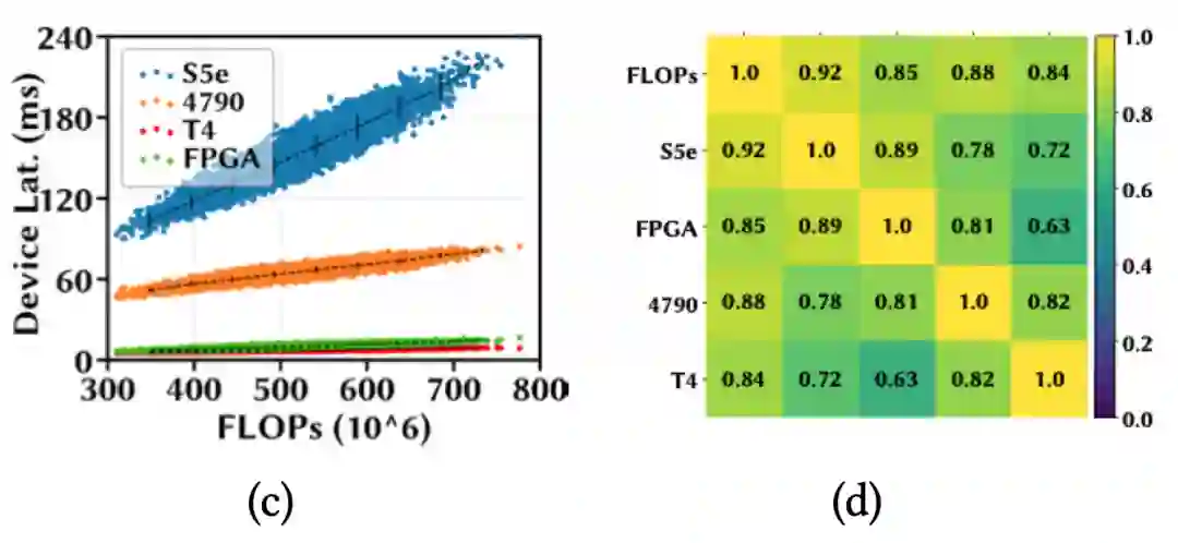 下图(a)用散点表示这些模型在四个设备上的推理延迟;图(b)用热力图来可视化设备之间模型延迟的相关系数,每个方格的颜色深浅和所标数值直观地表示一对设备间的SRCC大小。