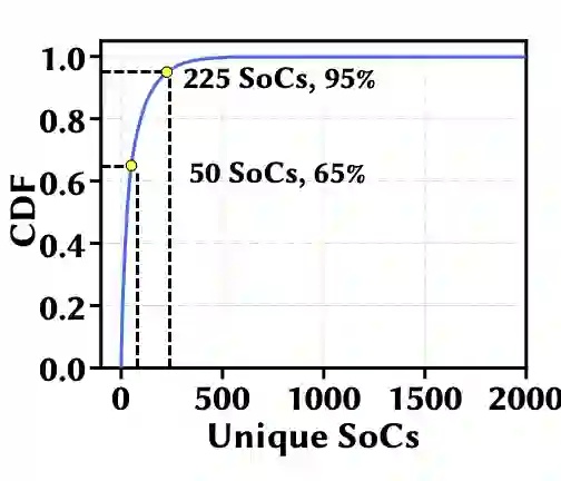 更复杂的是,CNN部署的目标设备极其多样化,包括移动CPU、ASIC、边缘设备、和GPU等。例如,光是移动设备,市面上就有两千多个SoC,排名前30的SoC才勉强各有超过1% 的份额。所以,如何在极其多样化的目标设备上有效地进行硬件适配NAS已成为一项挑战。