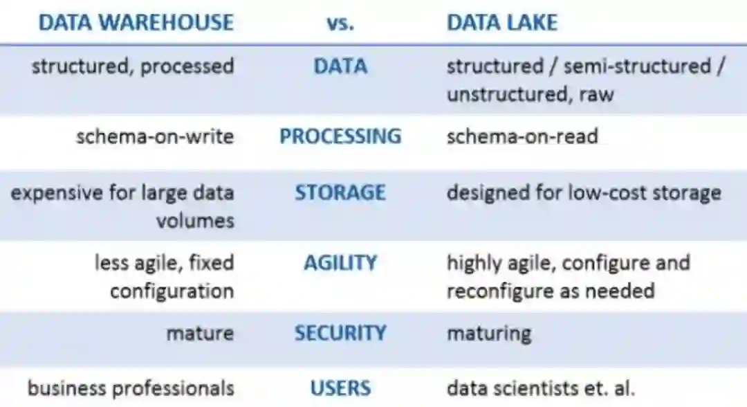 湖有点像一个开放的储物空间,可以存放结构化数据、非结构化数据、半结构化数据,存储成本很低,很灵活。仓更像是一个有无数小格子的储物间,所有数据需要按照要求放到小格子里。