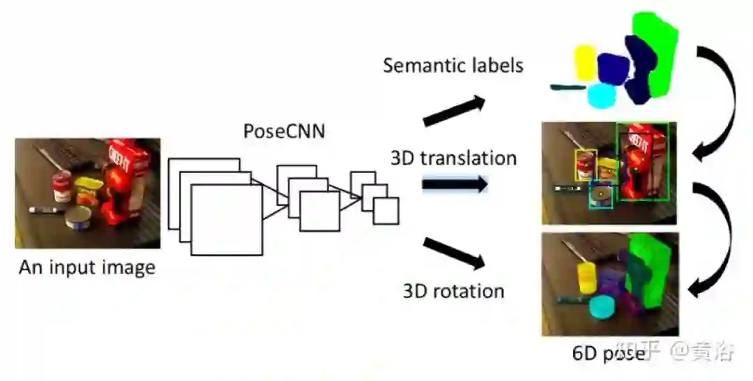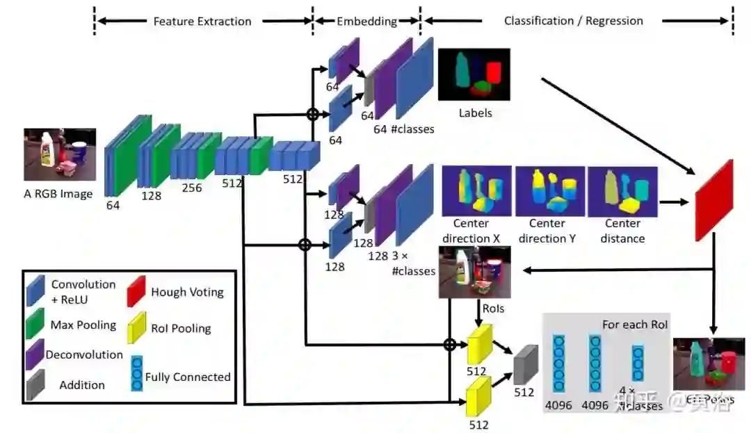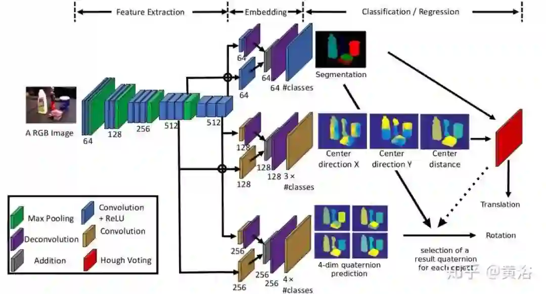 PoseCNN网络包含两个阶段。第一阶段包括13个卷积层和4个最大池化图层,它们从输入图像中提取具有不同分辨率的特征图。由于提取的特征在网络执行的所有任务之间共享,因此此阶段是网络的骨干。第二阶段包含一个嵌入步骤,该步骤将第一阶段生成的高维特征图嵌入到低维、任务特定的特征中。然后,网络执行3个不同的任务,从而实现6D姿势估计,即语义标记(FCN的变型),3D平移估计和3D旋转回归。