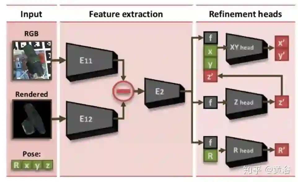 最后还有一个细化架构,如下图所示:网络会根据初始姿态建议预测精炼姿态。真实图像和渲染的作物被馈送到两个平行的分支中。计算出的特征张量之差是为了估计精确的姿势。