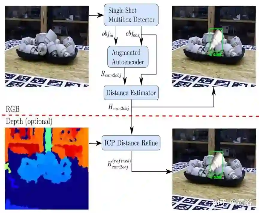 一个用于目标检测和6D姿态估计的基于RGB图像的实时流水线。该3D方向估计基于去噪 Autoencoder的一种变型,该变型使用域随机化(Domain Randomization)方法在3D模型的模拟视图上进行训练。