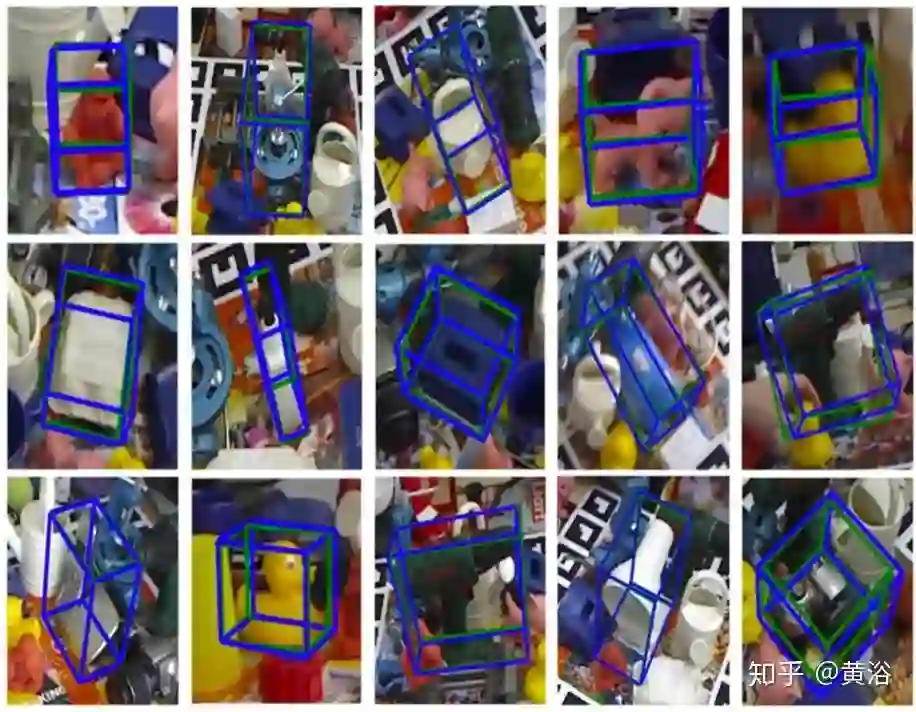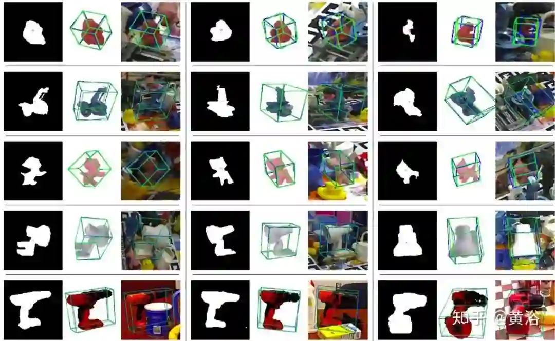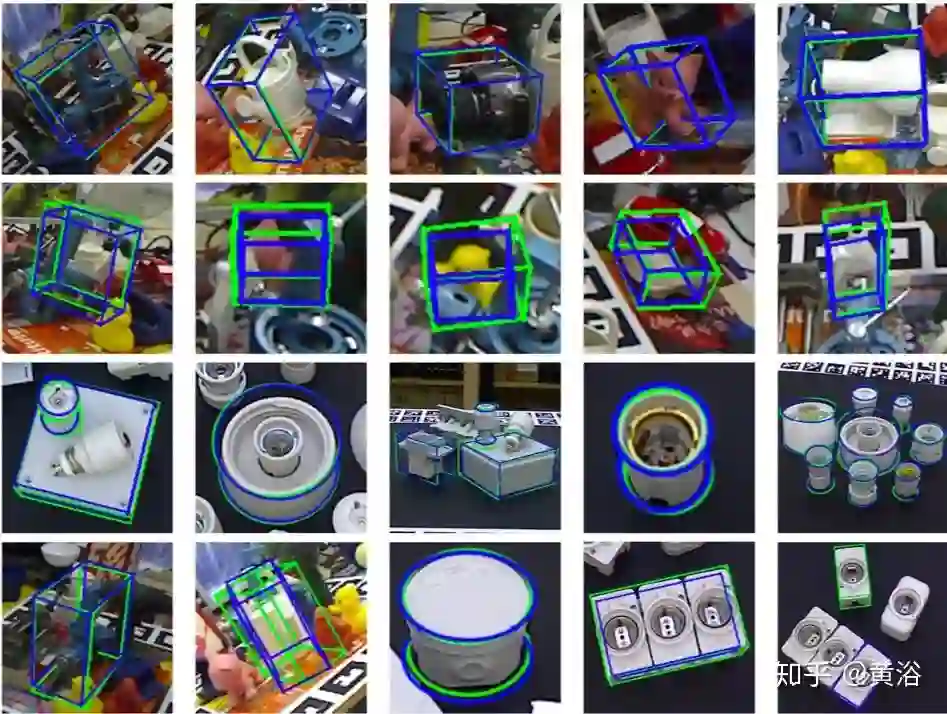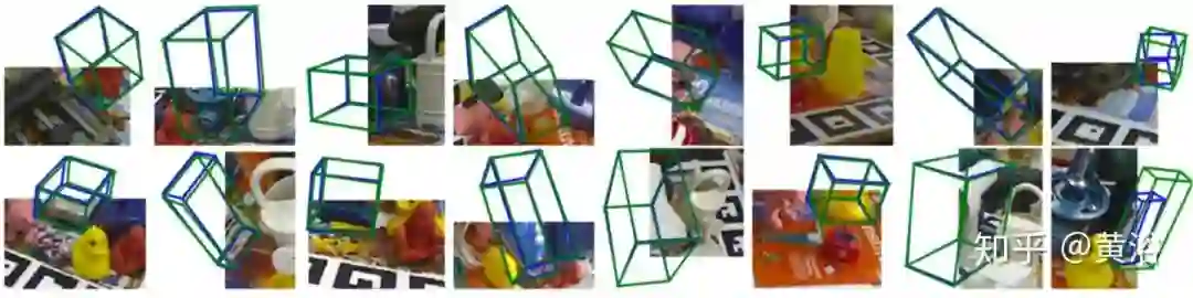 下图是一个姿势估计过程的示例。图像和二维检测结果作为输入。第一阶段,预测结果用于指定重要像素并调整边框,同时去除背景和不确定像素。第二阶段,有效坐标值和较小误差预测的像素,用附加RANSAC的PnP算法来估计姿态。结果中,绿线和蓝线表示真实姿势和估计姿势的目标3D边框。