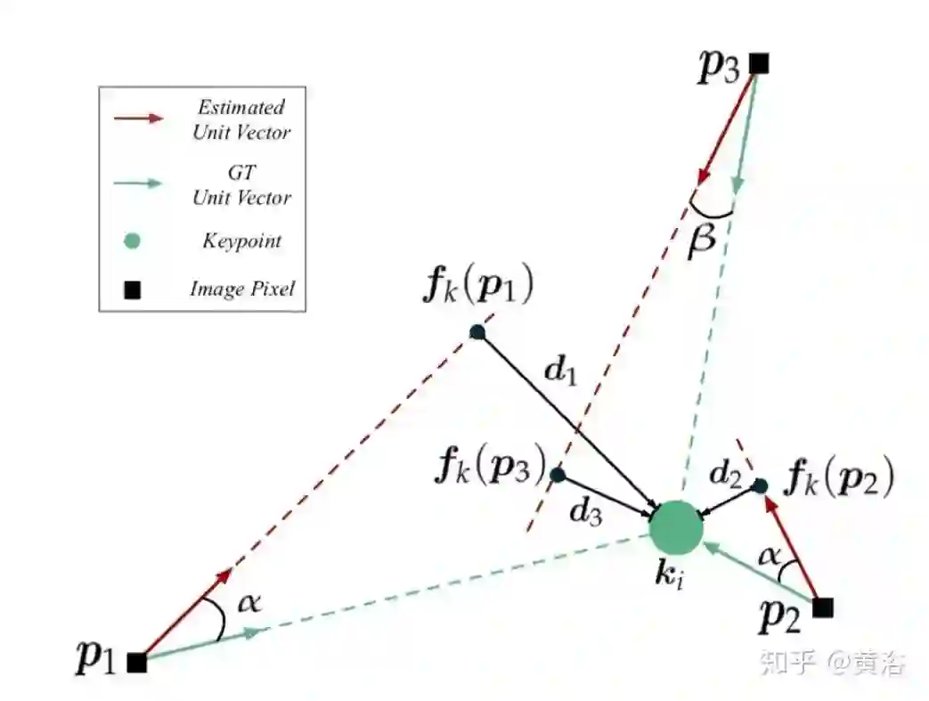 下图是DPVL示意图:假设方向矢量的估计误差相同(例如α),则像素与关键点之间的距离会影响假设与关键点之间的接近度。DPVL最小化代理假设fk(p⋆)与关键点ki之间的距离d⋆,以此实现关键点投票的准确假设。