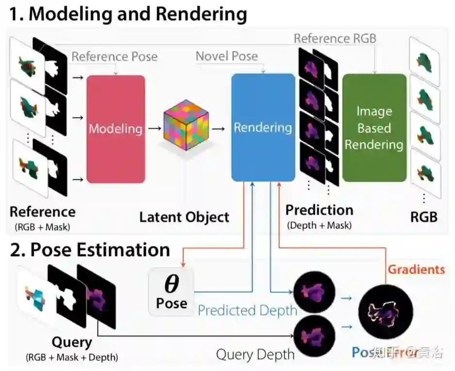 这项工作提出了一个没见过目标的6D姿态估计框架。它设计了端到端神经网络,该网络使用少量目标的参考视图来重建目标的潜在3D表示。用学习的3D表示,网络可以从任意视图渲染目标。使用该神经渲染器,可以根据输入图像直接优化姿势。通过使用大量3D形状训练网络进行重构和渲染,该网络可以很好地推广到没见过的目标。此外,它提出了一个用于没见过的物体姿态估计的数据集-MOPED(Model-free Object Pose Estimation Dataset)。