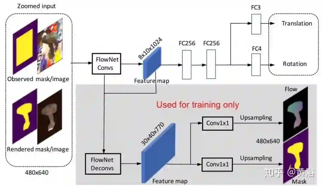 观察到的图像、渲染的图像和两个模版被连接到网络的8通道张量输入(对于观察/渲染的图像为3通道,每个模版为1通道)。它使用FlowNetSimple架构作为骨干网络,该网络经过训练可以预测两个图像之间的光流。姿势估计分支将FlowNetSimple的10个卷积层之后的特征图作为输入。它包含两个全连接层,每个层的尺寸均为256,然后是两个附加的全连接层,分别用于预测3D旋转的四元数和3D平移。在训练过程中,两个辅助分支可以规范化网络的特征表示,并提高训练的稳定性和性能。训练一个分支以预测渲染图像和观察图像之间的光流,另一分支被训练以预测在观察图像中模版的前景模版。其原理直观图如下图所示。