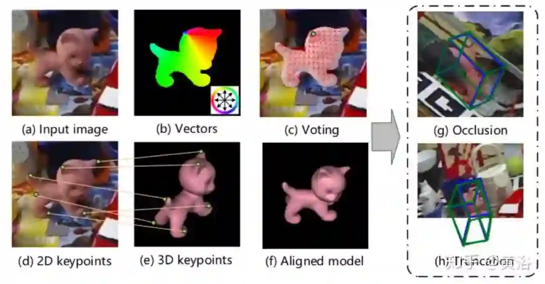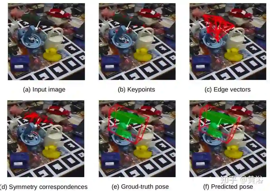 如图是关键点定位的概述图:(a)输入图像。(b)PVNet的架构。(c)指向目标关键点的逐像素单位矢量。(d)语义标签。(e)通过投票产生的关键点假设。(f)根据假设估算的关键点位置的概率分布。