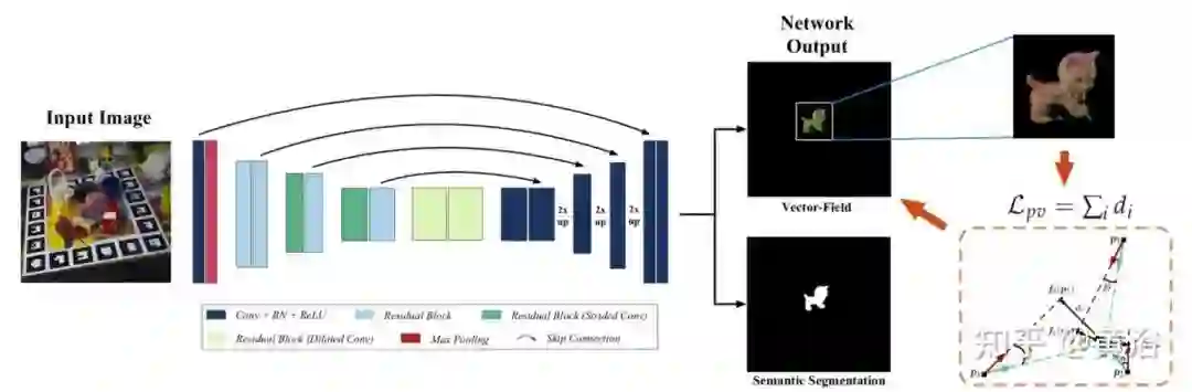 下图所示是该系统的流水线图。这项工作着重于获得准确的初始姿态估计。特别是,此方法旨在精确定位和估计目标的朝向和平移而无需任何改进。目标姿态由从目标坐标系到摄像机坐标系的刚性转换表示。由于基于投票的方法已经证明了其对遮挡和视图更改的鲁棒性,因此这里采用基于投票的姿势估计流程。具体地,该方法首先从矢量场对目标关键点的2D位置进行投票,然后通过解决PnP问题来估计6DOF姿势。