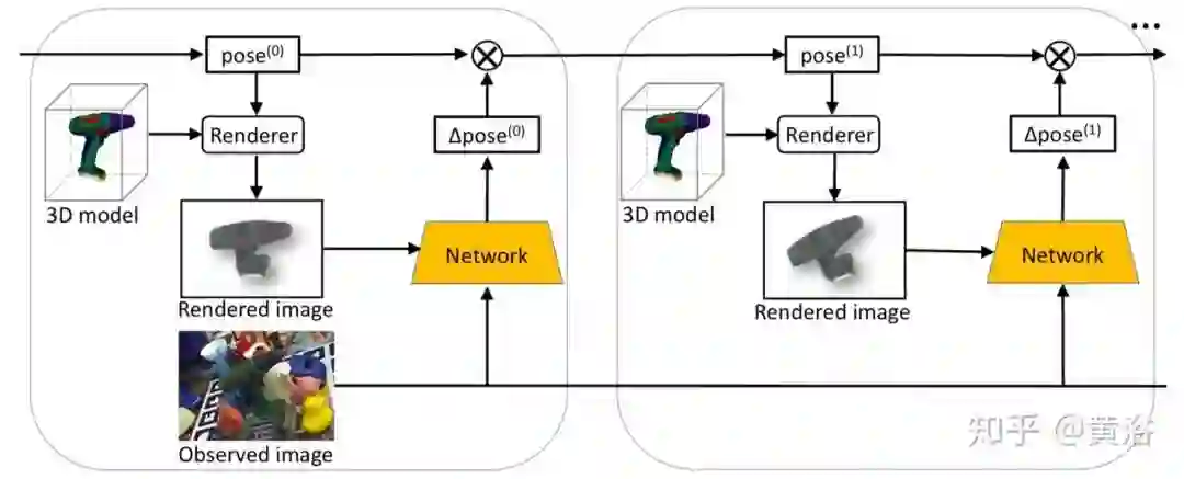 如图所示是DeepIM的示意图。训练网络预测其相对SE(3)转换,该转换可以应用于初始姿势估计并进行迭代的姿势优化。给定目标的6D姿势估计(无论是来自PoseCNN还是来自先前迭代的姿势)以及目标的3D模型,它都会在粗略姿势估计下生成显示目标外观的渲染图像。利用渲染图像和观察图像的图像对,网络可以预测相对变换,该变换可用于完善输入姿势估计。