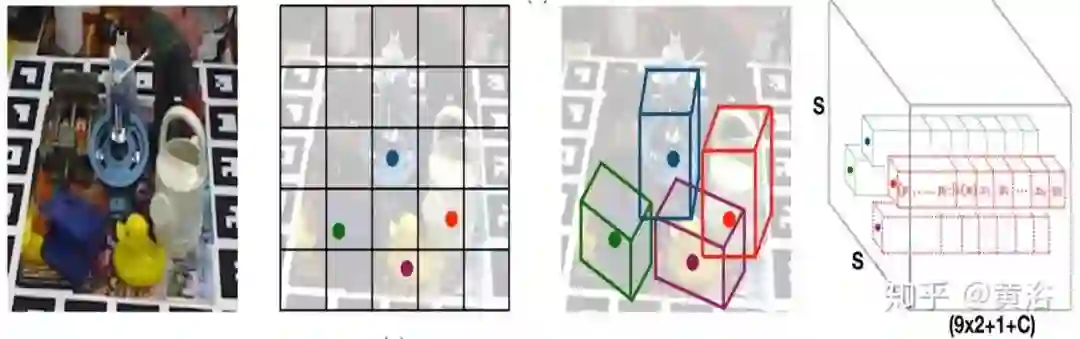 如图从左到右依次是:具有四个目标的示例输入图像-》S×S网格显示负责检测四个目标的单元-》每个网格预测图像中投影的3D边框角点2D位置-》来自网络的3D输出张量代表每个网格的矢量,该矢量由2D角点位置、类别概率和与预测相关的置信度值组成。