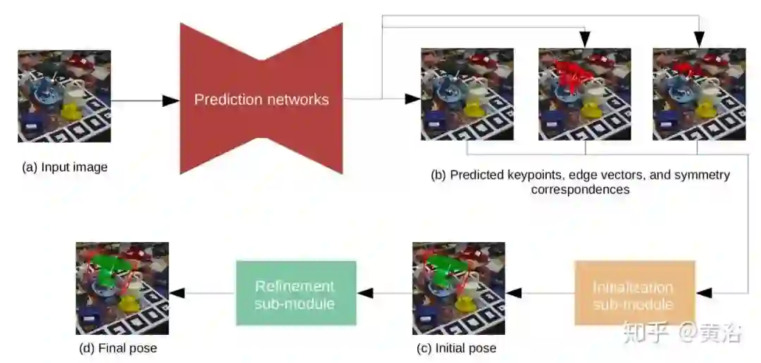 关键点网络采用了现成的预测网络PVNet。边缘网络沿着预定义关键点图预测边缘向量,当关键点在输入的图像比较混乱时,这可以稳定姿势回归。对称网络(FlowNet 2.0的扩展)预测反映基本(部分)反射对称轴的对称对应。姿态回归模块优化目标的姿态适合三个预测网络的输出(如同遵循EPnP框架的P3P求解器)。如下图是其架构图: